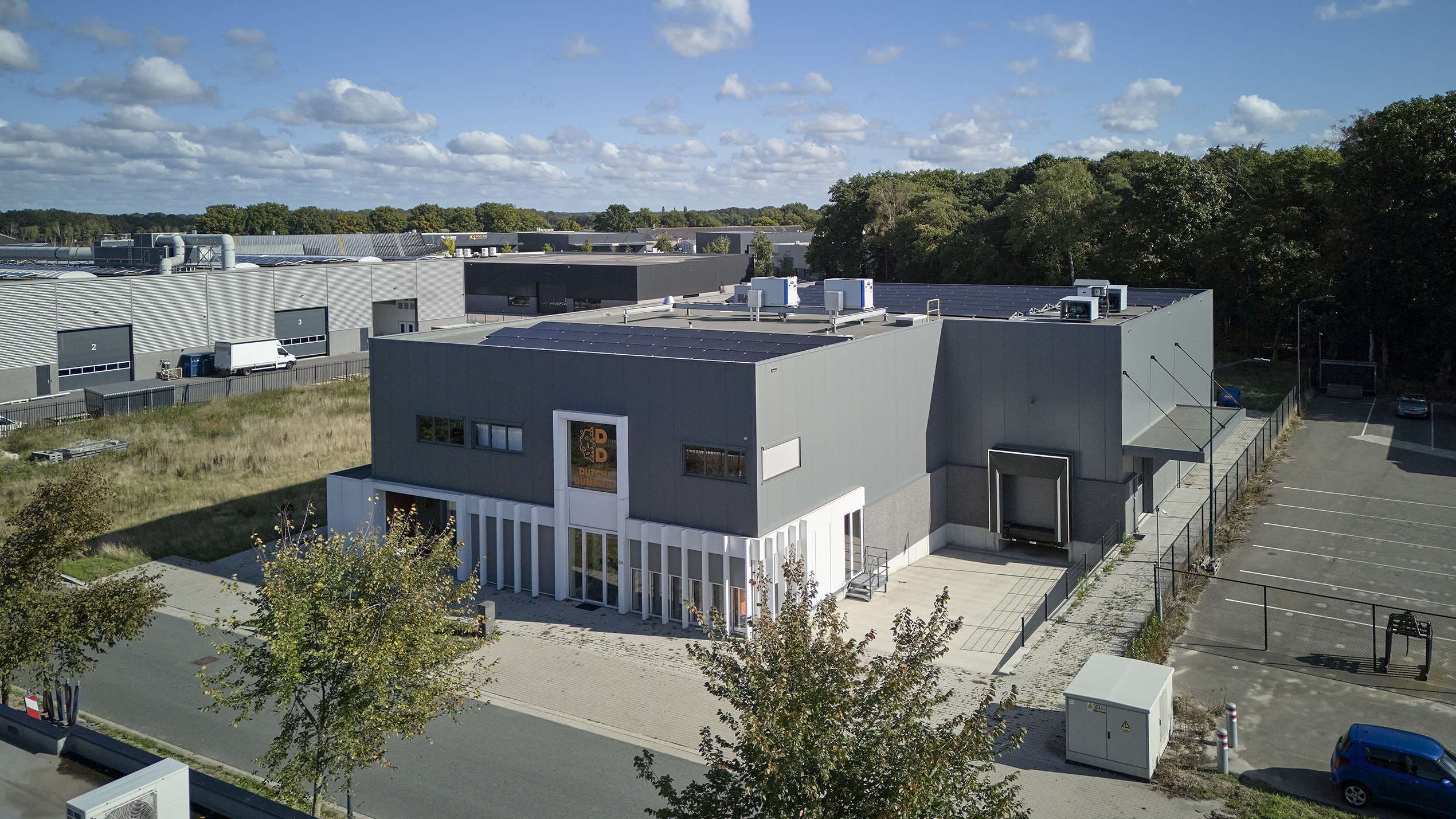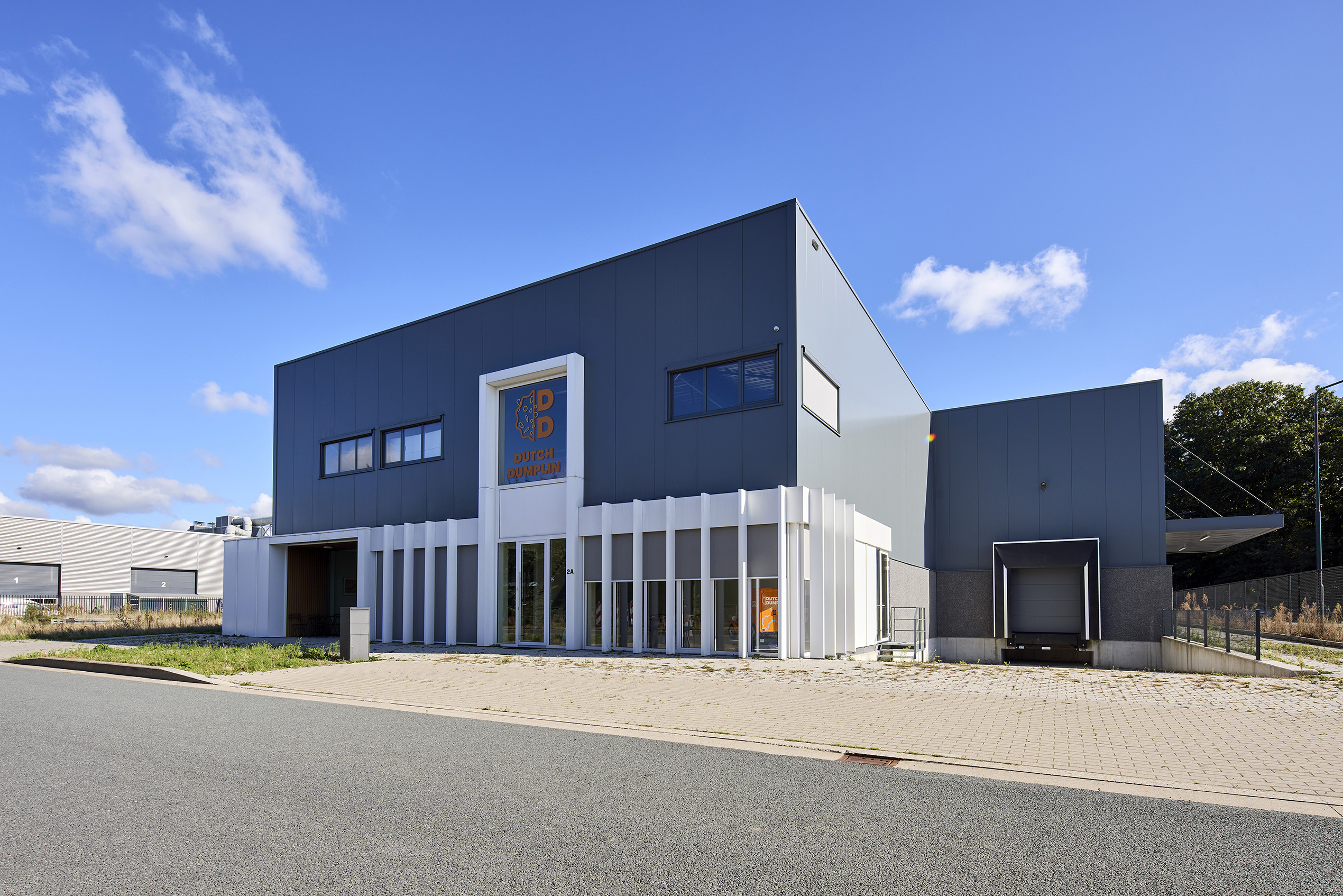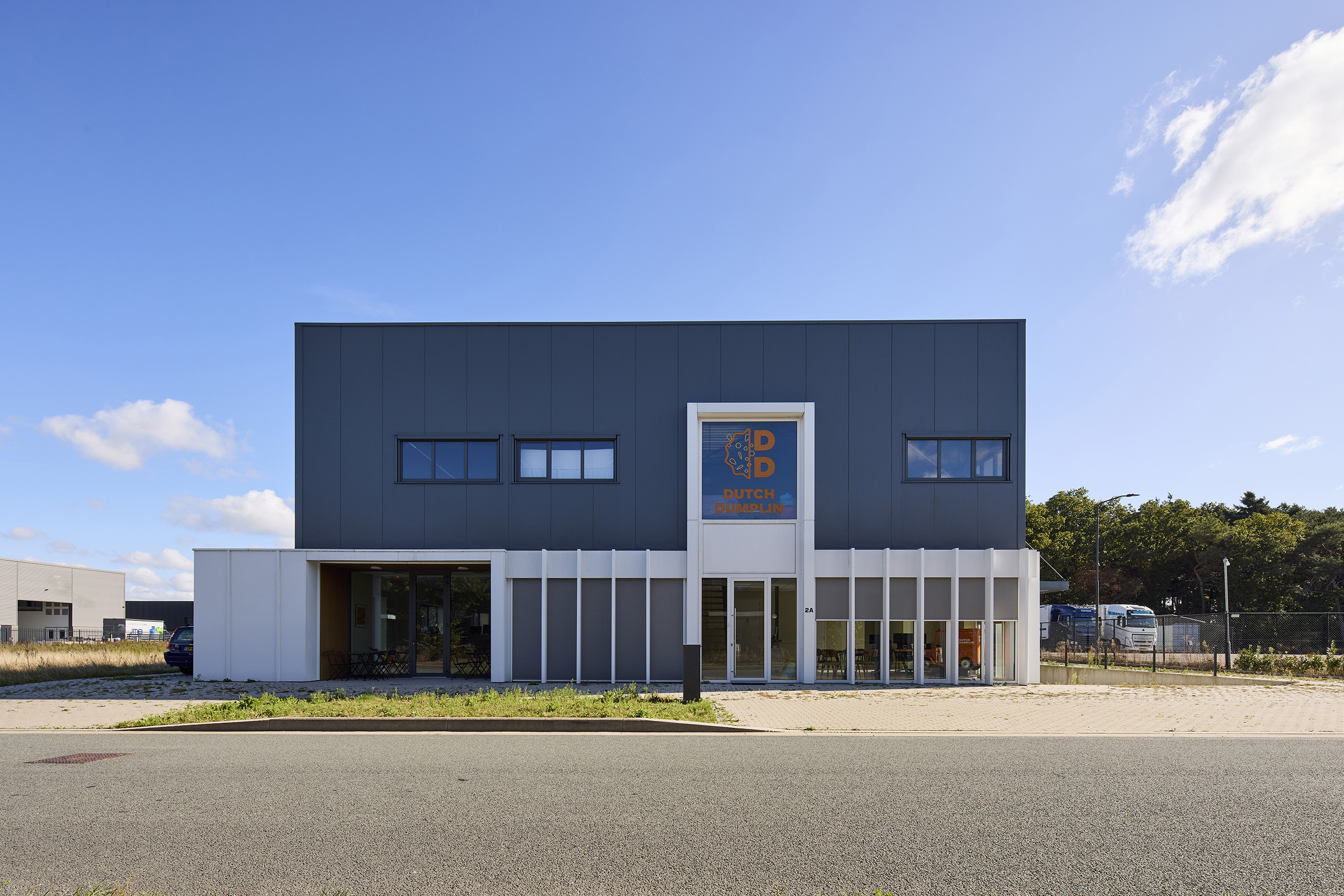 Onderdelen: Staalconstructie, betonwanden, kanaalplaatvloer, dakplaten en wandbekleding inclusief aluminium composiet, trap en balustrade.